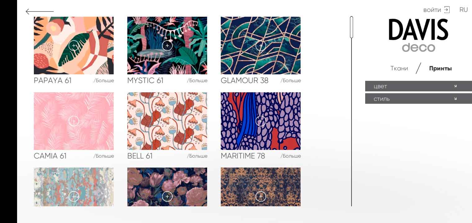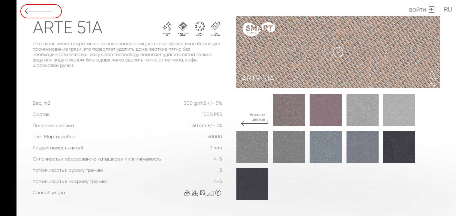 С правой удобное меню. С его помощью вы можете подобрать ткань по: