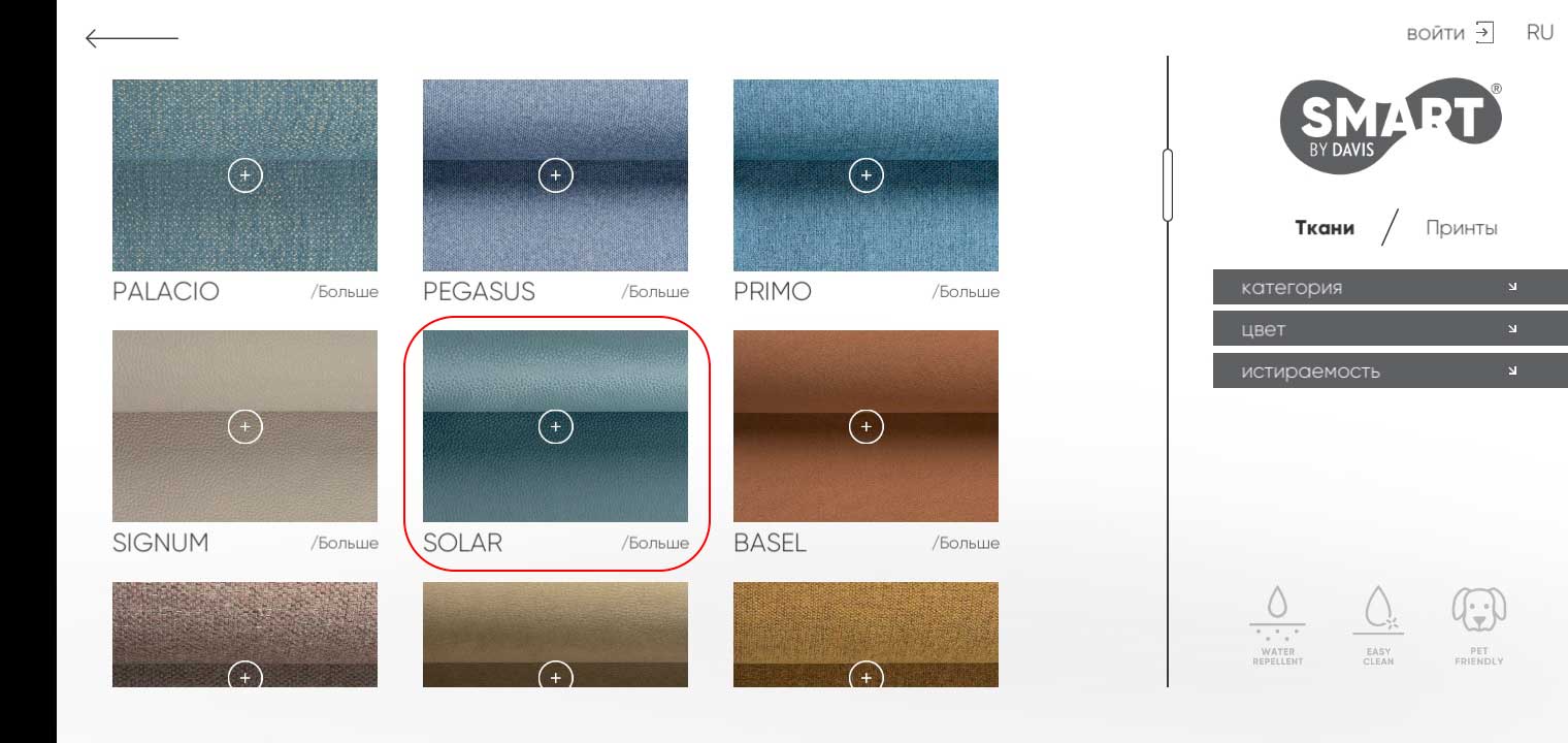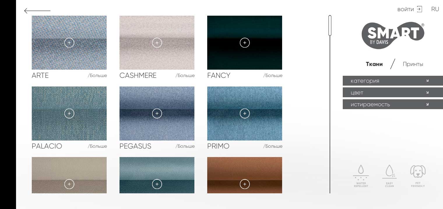 Вы попадаете в каталог тканей. Здесь представлены все обивочные материалы.