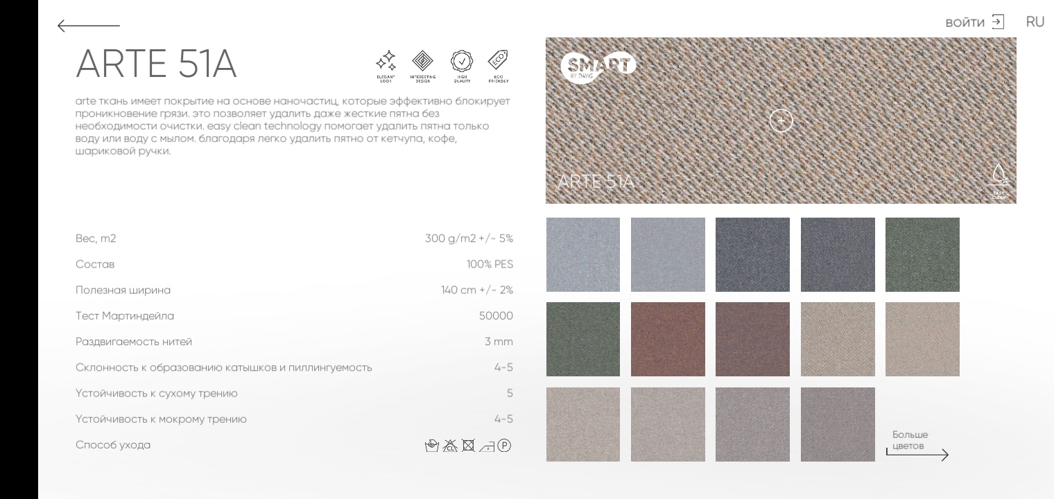 Выбранный диван изначально сделан в ткани Arte. Поэтому в меню представлена вся коллекция.